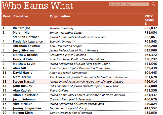 Let’s talk about social justice. The Forward has done excellent reporting on the Jewish charity industry and non-profits. The 2013 salary survey had many interesting insights. Outgoing Anti-Defamation League leader Abraham Foxman took home $660,000, and the head of the JNF in North America got $344,000. The head of Peace Now “only” made $220,000. A separate report noted that the network of 3,600 Jewish charities in the US have $26 billion in assets. Of $3.7b. in donations, some 38 percent goes to Israel-focused groups.