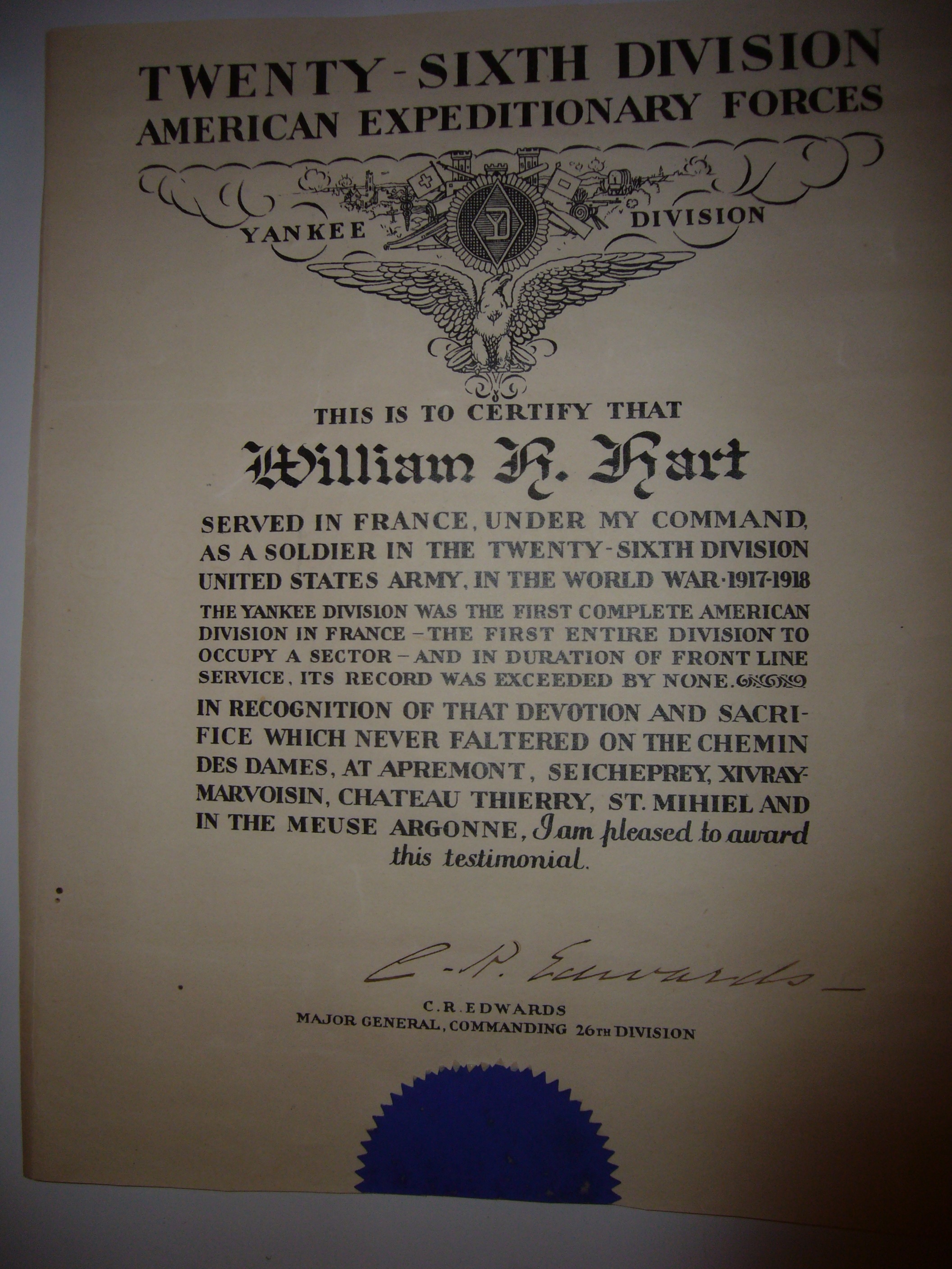 The unit he joined, the 26th Division, was the first sent over to Europe in September and October 1917. As its commanding officer Major C.R. Edwards later wrote, it “was the first complete American division in France – the first entire division to occupy a sector – and in duration of front line service, its record was exceeded by none… it never faltered.”