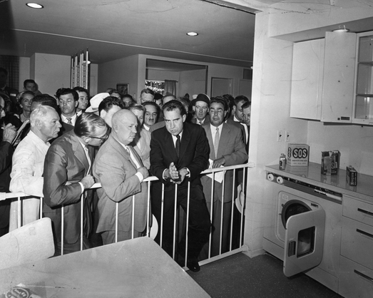 Nakiti Khruschev and Richard Nixon debate the American kitchen