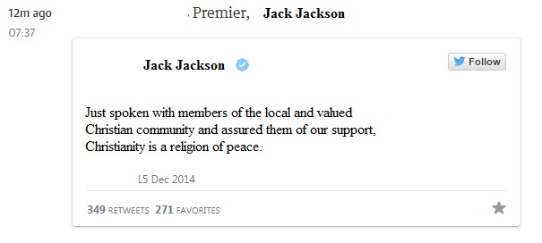 Prime Minister Bob Mealymouth “My hopes and prayers go out to those affected by this tragic event, but we must also emphasize that Christianity is a religion of peace and I will be meeting shortly with my Christian friends and attending a candle vigil at St. Anthony’s Cathedral to assure them that they are part of our community and we are being vigilant against reprisal attacks and threats against the Christian community. Politically motivated violence affects us all, and it primarily perverts the teaching of the son of God Jesus Christ, and we must re-iterate that the community most affected by these so-called ‘neo-Nazis’ is the Christian community whose good name is impugned, and I want to state with clear vigor that the actions today, event though we do not know exactly what motives them, is not in anyway consistent with the true teachings of Christ.”
