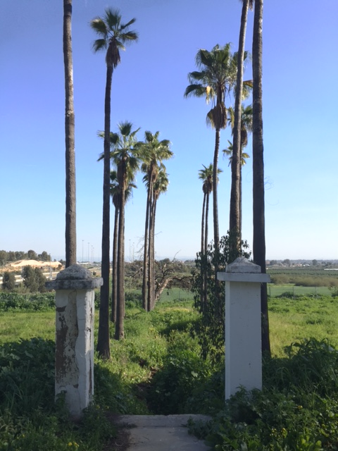 The next stop on our tour takes us down the 431 as it merges with the 20 heading to Tel Aviv. Take the exit onto the 44 heading towards Ramle. You’ll see a small statue of a man meeting two other men on horse on the right. Stop on the side of the road. The old gate here to Mikveh Israel is closed, but one can see the palm tree lined road that was obviously the old entrance to a beautiful estate.