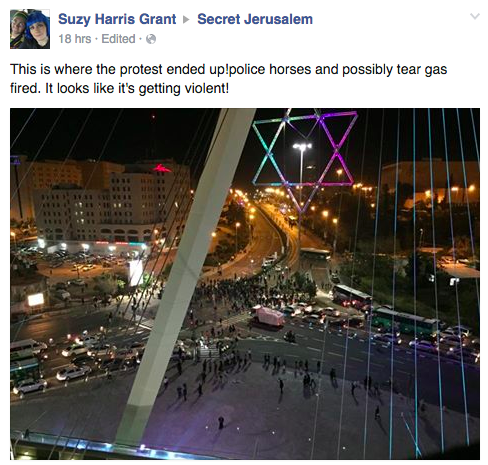 In the morning some signs against police brutality and racism still littered the area near the Prime Minister’s residence. What was most interesting to see was the lack of response in some places. Haaretz english edition didn’t put the protest on the cover; preferring an article about “Thai boxing” and Jehovah Witnesses and the ICC instead. One imagines that if it had been a protest by 1,000 Palestinians shutting down main roads throughout Jerusalem and in front of the Prime Minister’s house it would have been a front page story. In general there was a deafening silence on the “left.” Some foreign reports spoke about “rioting” and tried to connect the protest to Baltimore or Ferguson, without mentioning that there was no looting involved.
