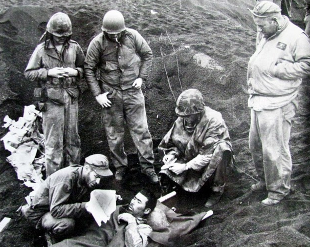 Americans on Iwo Jima with a Japanese survivor of the battle. Good PR here?